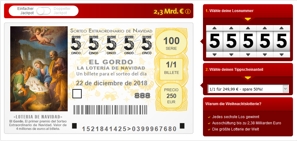 Sichern Sie sich jetzt Ihren exklusiven El-Gordo-Gutschein: Zwei 1/20-Lose der Spanischen Weihnachtslotterie zum halben Preis! Verdoppeln Sie Ihre Gewinnchance auf die legendären Millionenpreise – und sparen Sie gleichzeitig 50 %.